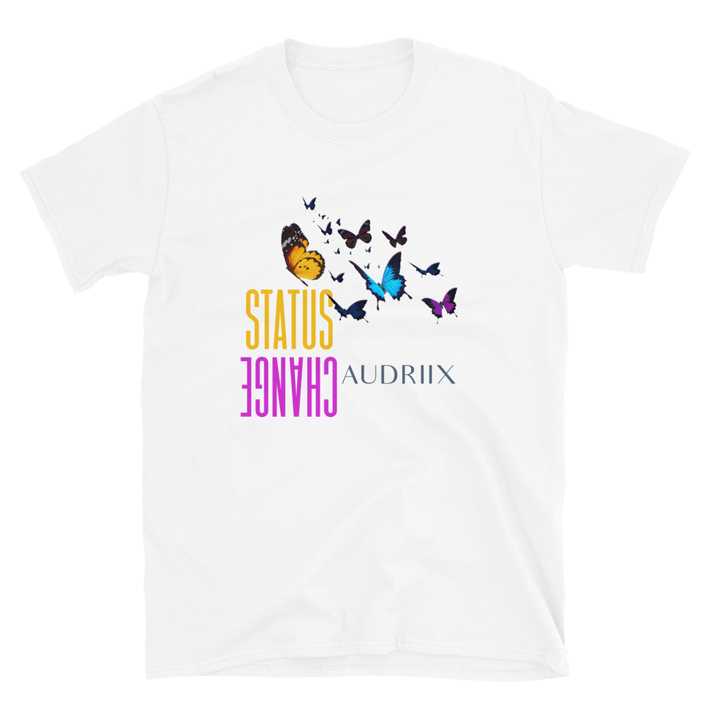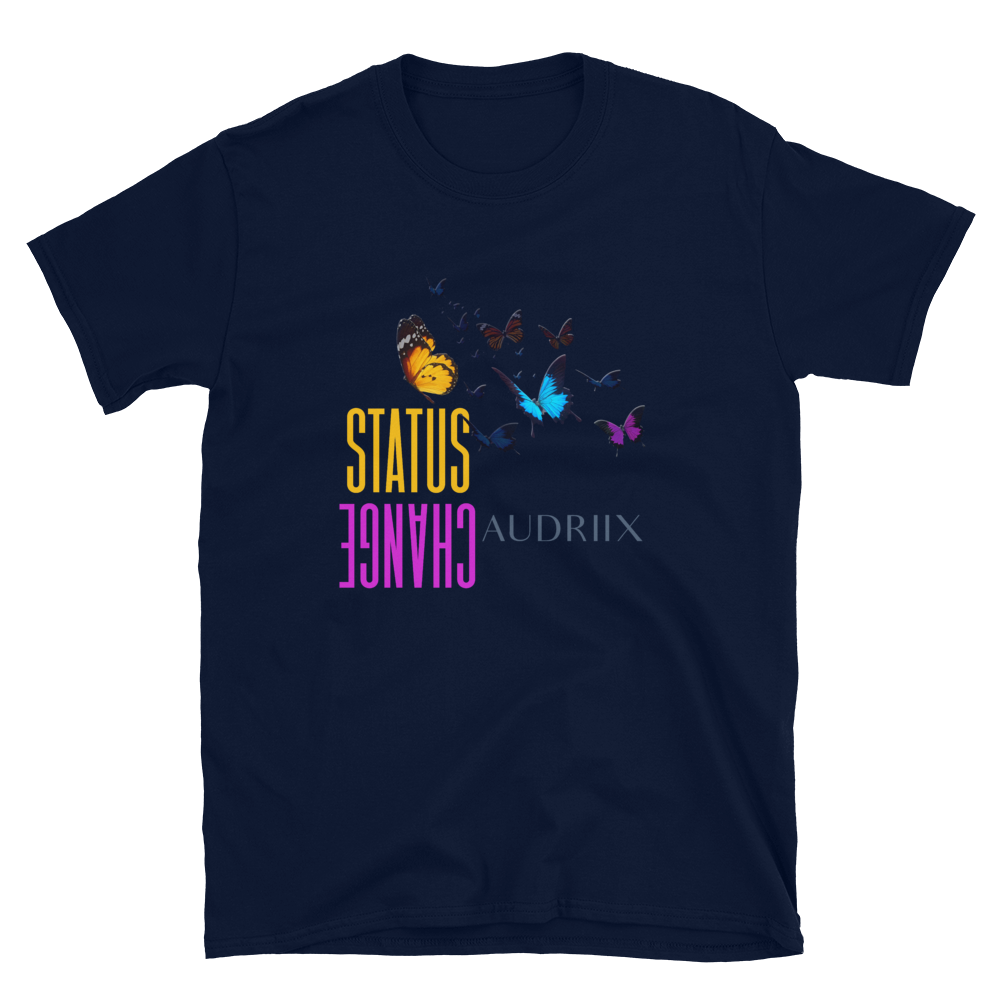 Navy or white unisex t-shirt with "Status Change," butterflies, and Audriix logo on front.